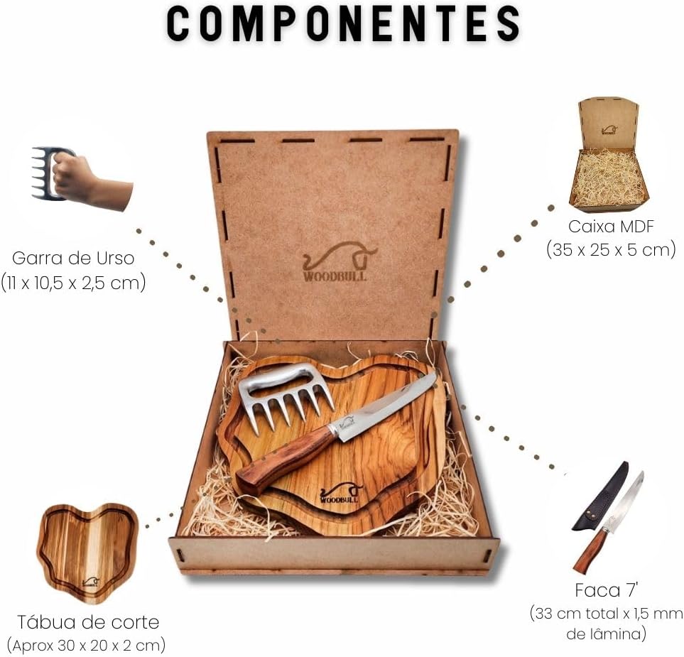 Kit Churrasco Edição Especial, com Ferramentas para Preparar e Servir Carnes com Estilo, Ideal para Churrascos, Festas e Presente, Tábua Artesanal, Faca Inox 7" e Garra de Urso – WOODBULL.