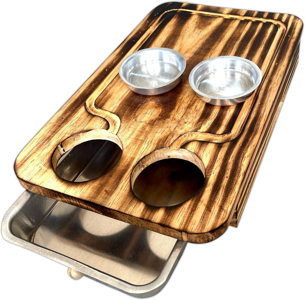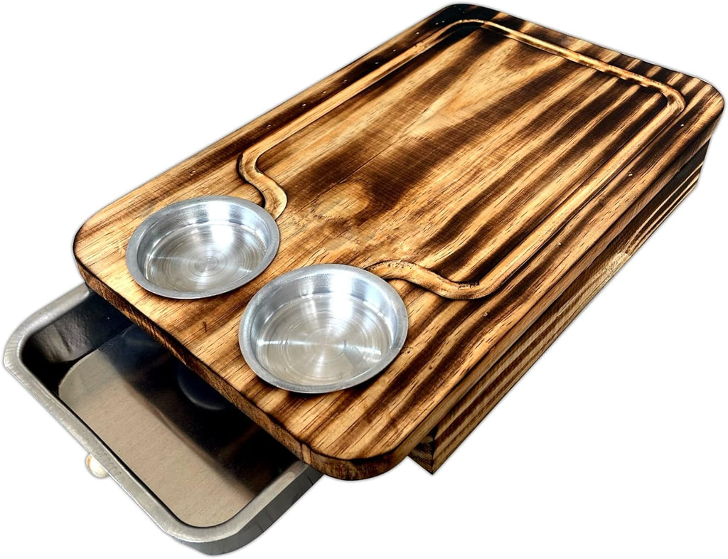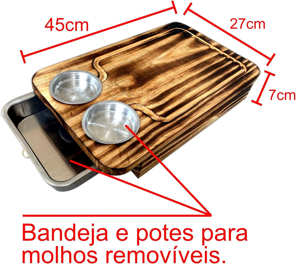 • DESIGN FUNCIONAL: Tábua com sulcos para captação de líquidos e dois recipientes removíveis para molhos e temperos