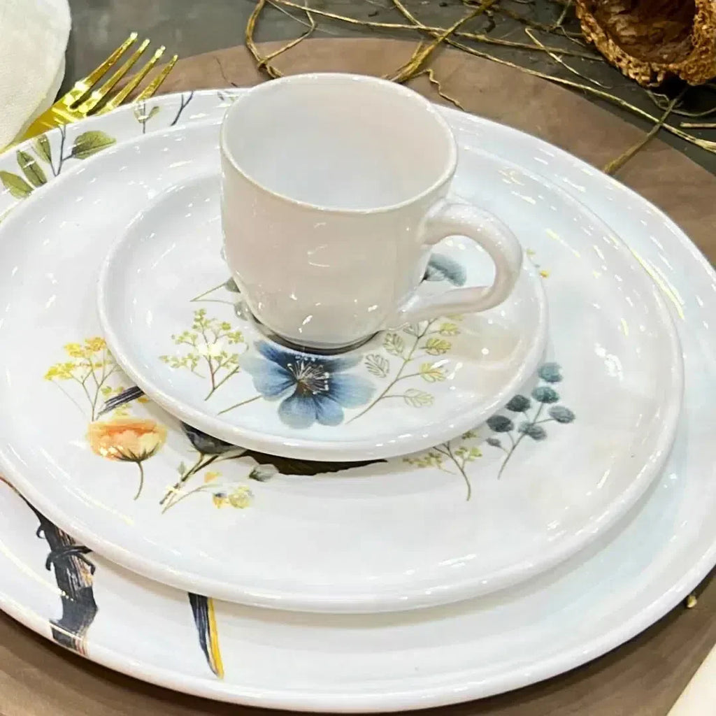 Inspirada na leveza dos jardins floridos e no canto suave dos pássaros. Com delicados padrões de pássaros e flores, suas peças criam composições românticas e acolhedoras, ideais tanto para um café da manhã sereno quanto para um jantar especial. A riqueza de detalhes e os tons harmoniosos das peças transmitem aconchego, deixando cada refeição ainda mais especial, pintado a mão.