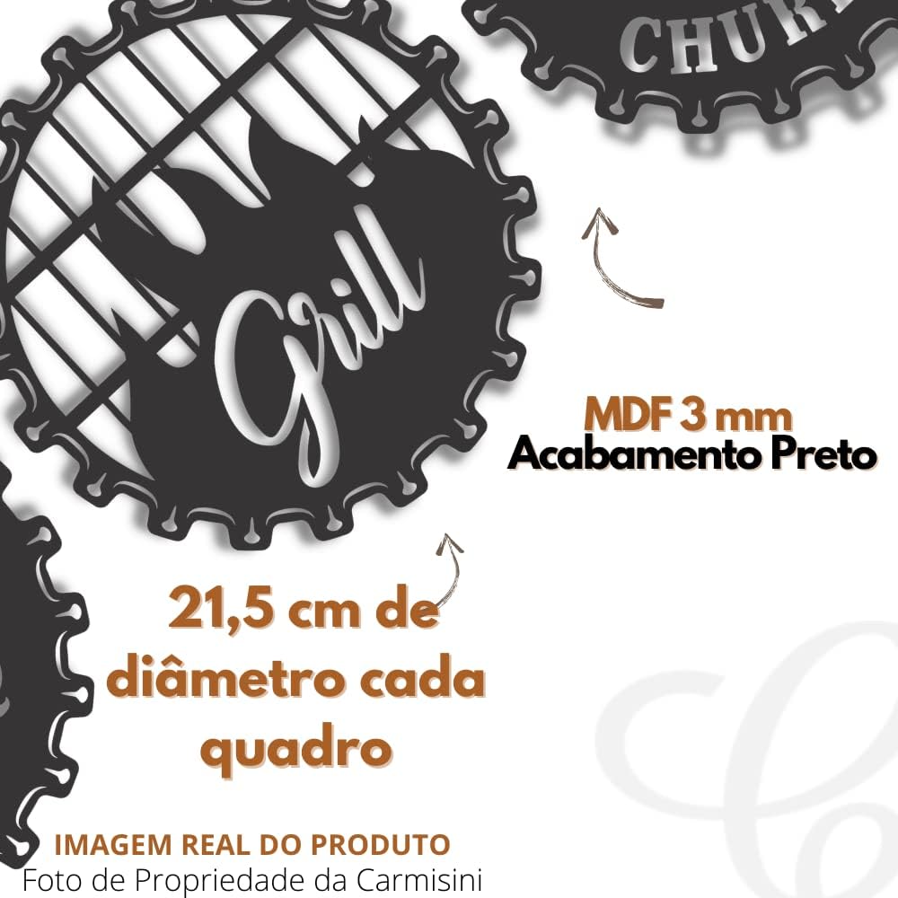 • Trio de Quadros em Mdf 3mm na cor Preta Cada Lar tem um cantinho especial onde vivemos ótimos momentos com a família e amigos, compartilhando histórias e experiências. Normalmente esses momentos vêm acompanhados de um churrasco, cerveja, música e muita alegria. Se você tem churrasco no sangue ou gosta de grelhar um pouco nos fins de semana, este Kit de placas é exatamente o que você precisa para criar um ambiente diferenciado. Use sua imaginação para criação de um espaço total