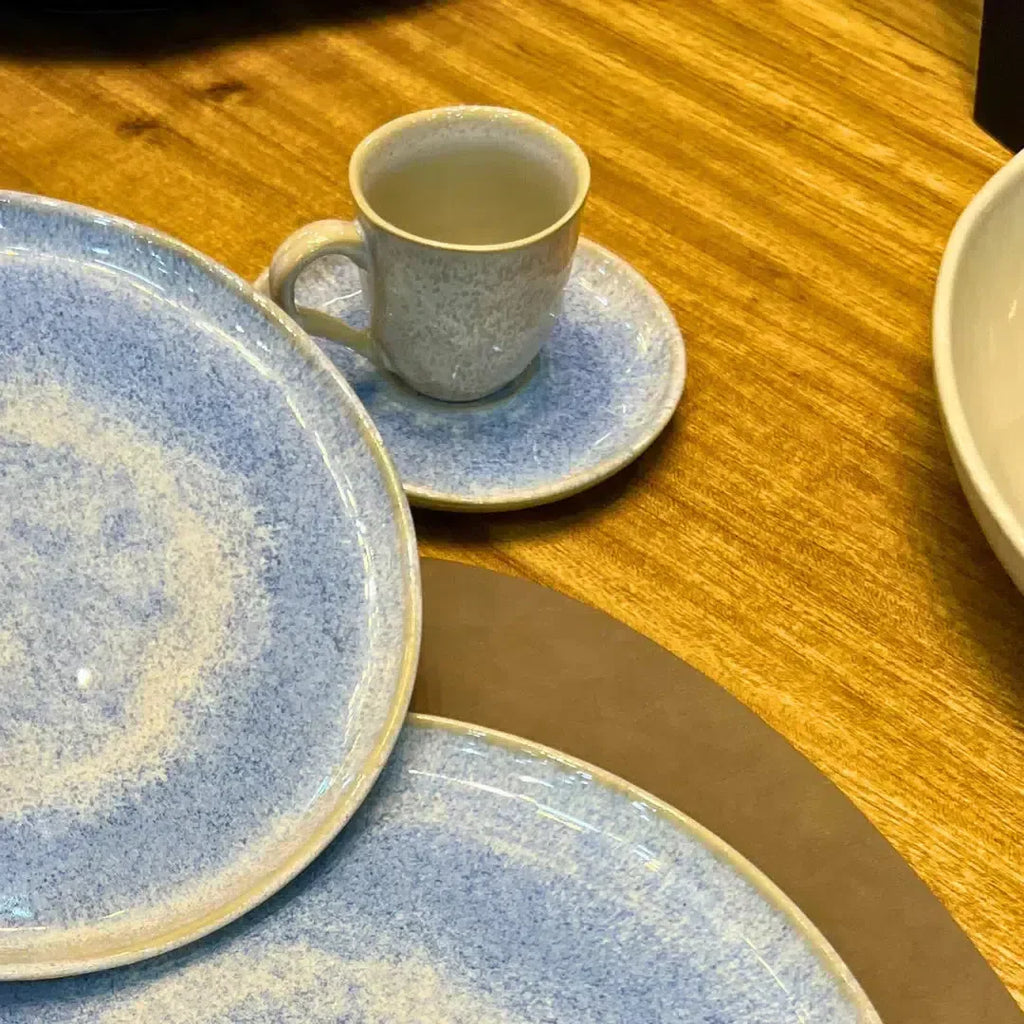 Com um delicado efeito de borrão em tom azul que evoca a serenidade das águas e remete a leveza e o movimento das ondas do mar. O design refinado e fluido das peças, combinados com suas tonalidades suaves e formas orgânicas, criam um cenário tranquilo e acolhedor à mesa e a tornam um convite para momentos de contemplação e bem-estar.