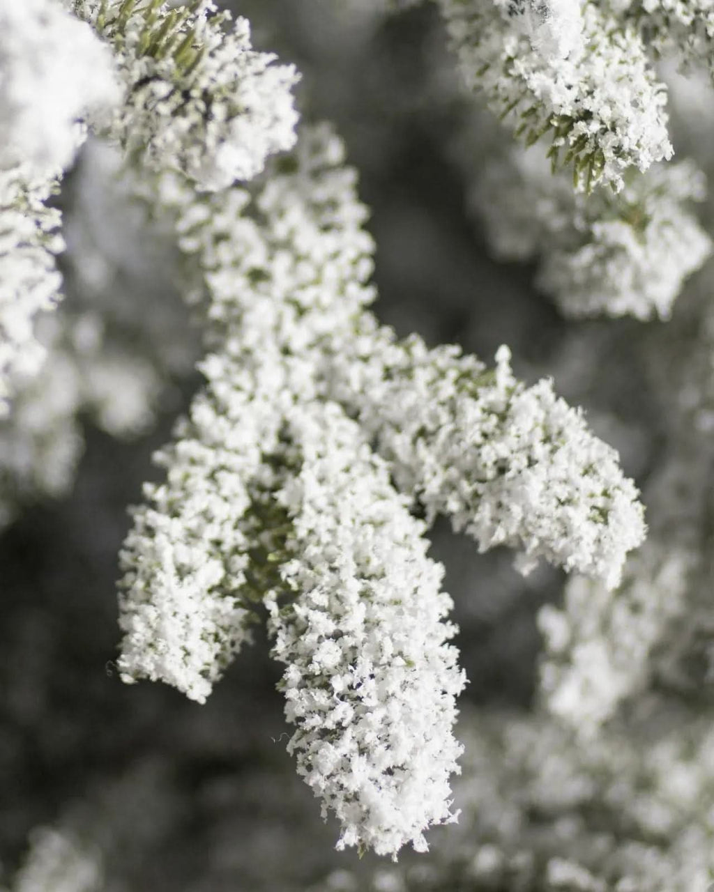 - Material: galhos em PVC de alta qualidade com acabamento nevado; suporte em metal reforçado