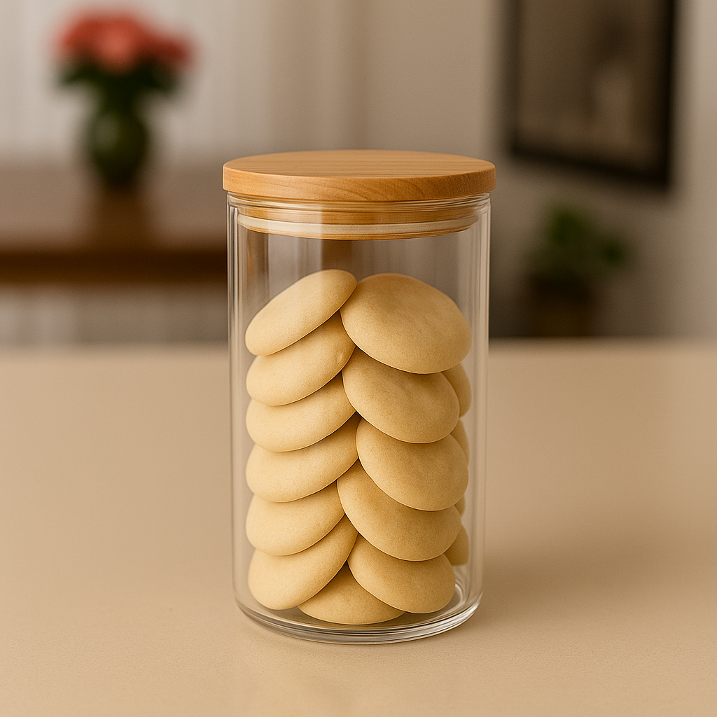 🍪 1 pote de vidro com tampa de bambu para biscoitos;
